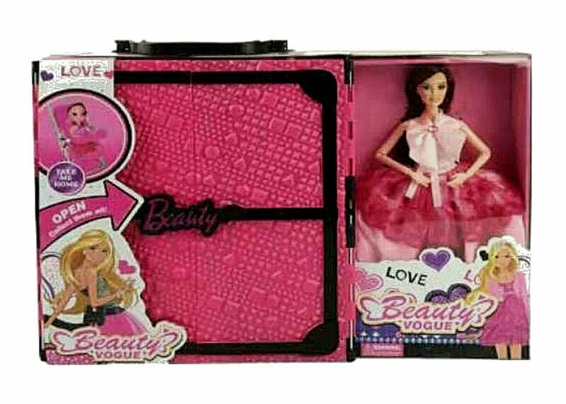 Lalka z otwieraną szafą z akcesoriami. Szafa w formie walizki o wymiarach 28,5x31x7,5 cm. W szafie znajdziemy: sukienki, biżuterię, torebki, buty, szuflady, półki, drążek na ubrania, wózek i łóżeczko dla dziecka. Lalka ma 29 cm. Posiada na twarzy lekki makijaż oraz posiada długie włosy ułożone w...