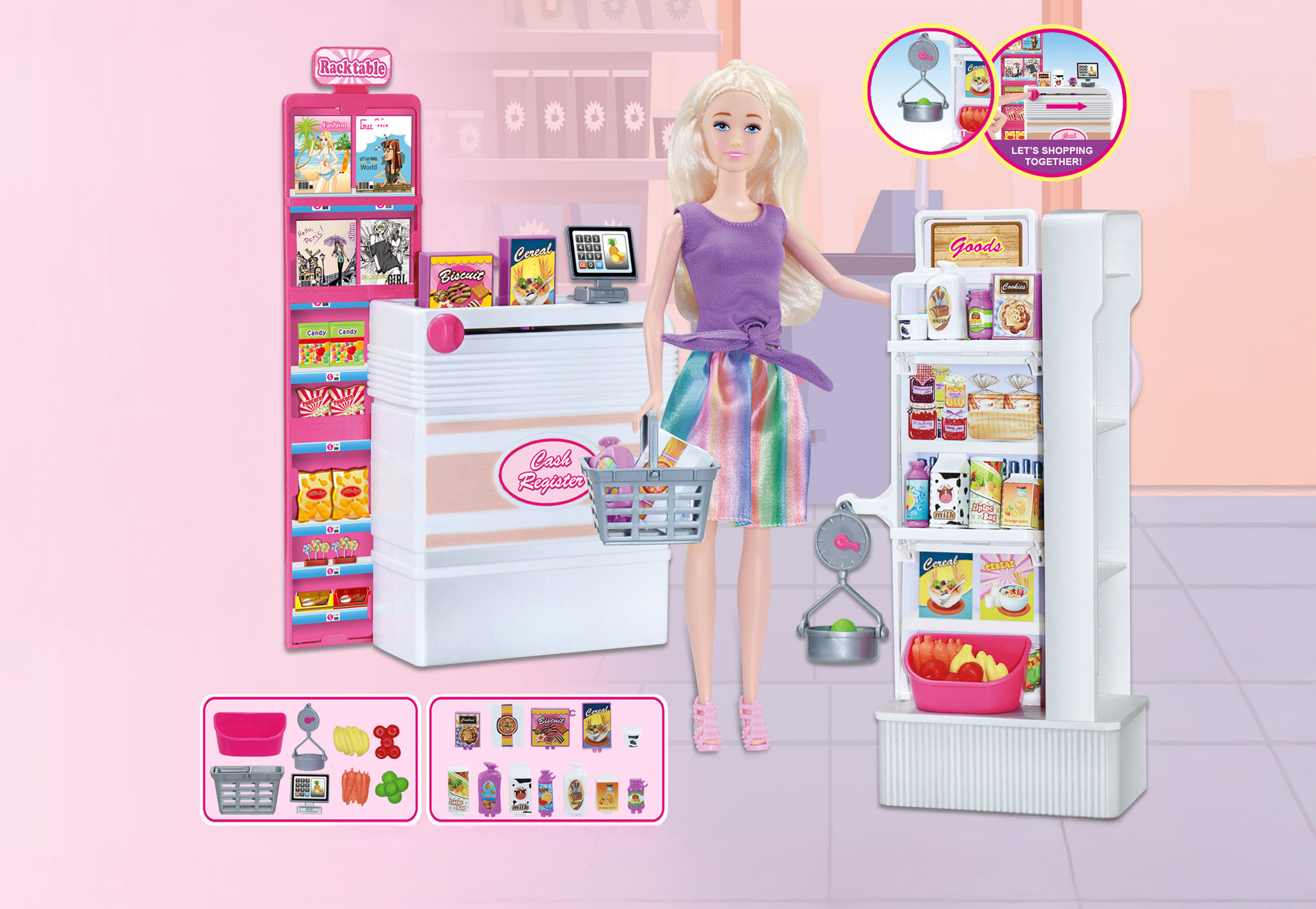 Panenka prodavačka. Velikost 30cm. Obsahuje panenku, regál na zboží, potraviny a zboží, pokladnu s pásem, nákupní košík a další doplňky. przeczytaj całość