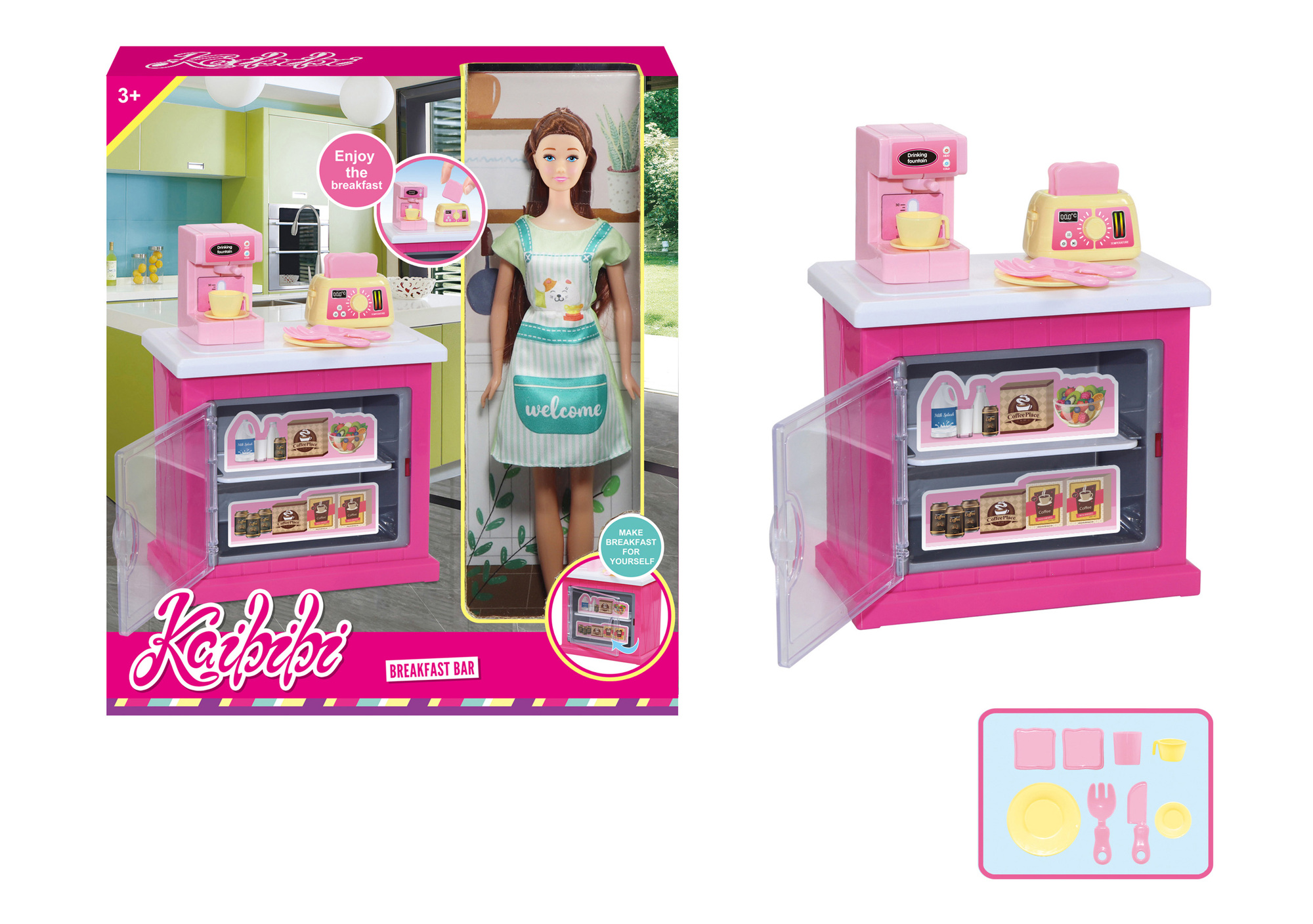 Panenka kuchařka. Velikost panenky 30cm. Obsahuje panenku, kuchyňskou skříňku, kávovar, topinkovač a další doplňky. przeczytaj całość