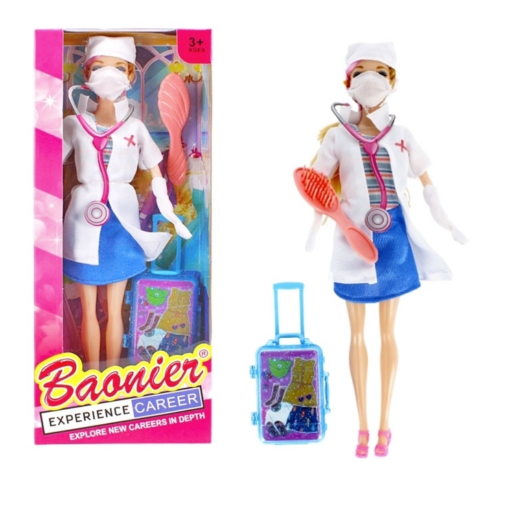 Každá holčička ve své sbírce hraček musí mít panenku po vzoru panenek Barbie. Tato sada s panenkou Nurse je dokonalým řešením, jak trávit čas společně se svým dítětem a ukázat povolání zdravotních sester! Panenka 29 cm Sestřička v zástěře, čepičce, sukni, halence, botách. K panence je navíc přibalen kufřík na potřebné produkty při domácích návštěvách u pacientů a kartáč na vlasy. Určeno pro děti od 3+ let.