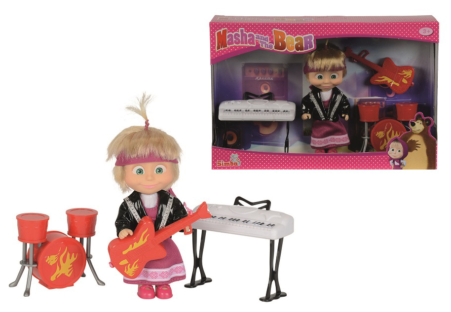 Panenka Máša z dětského seriálu "Máša a medvěd". Tentokrát jako hudebnice s kytarou, bubny a klávesy. Výška panenky 12 cm. przeczytaj całość