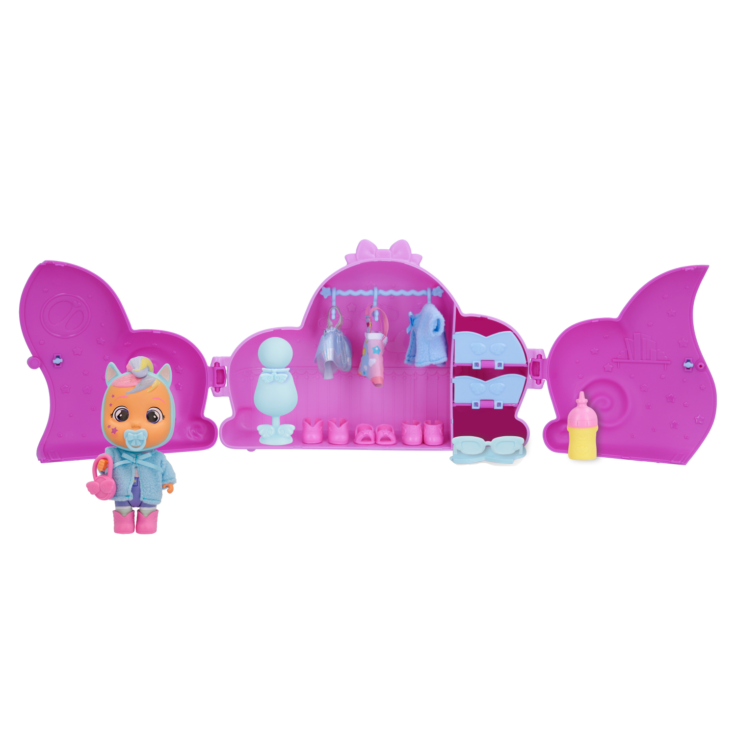 Hrací sada The Cry Babies Magic Tears Dress Me Up Jennina šatní skříň podněcuje dětskou fantazii a vytváří nekonečné vzhledy a příběhy, které se panence budou hodit. Tato dokonalá šatní skříň ve tvaru mraku poskytuje dostatek prostoru pro uložení všech oblíbených oblečků, bot a doplňků Cry Babies...