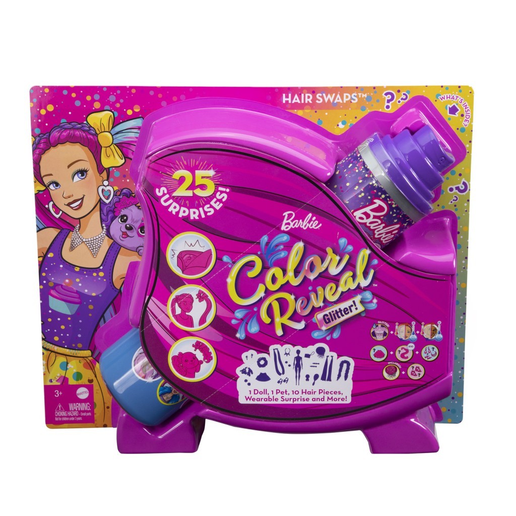 Tyto třpytky Barbie Color Reveal! S 25 překvapeními nabízejí panenky Hair Change maximální zábavu při rozbalování – jednoduše otevřete přední část a najdete 15 sáčků s překvapením se skrytými doplňky a navíc nádobku Barbie Color Reveal navrženou jako lahvička s lakem na vlasy! Vyjměte panenku...