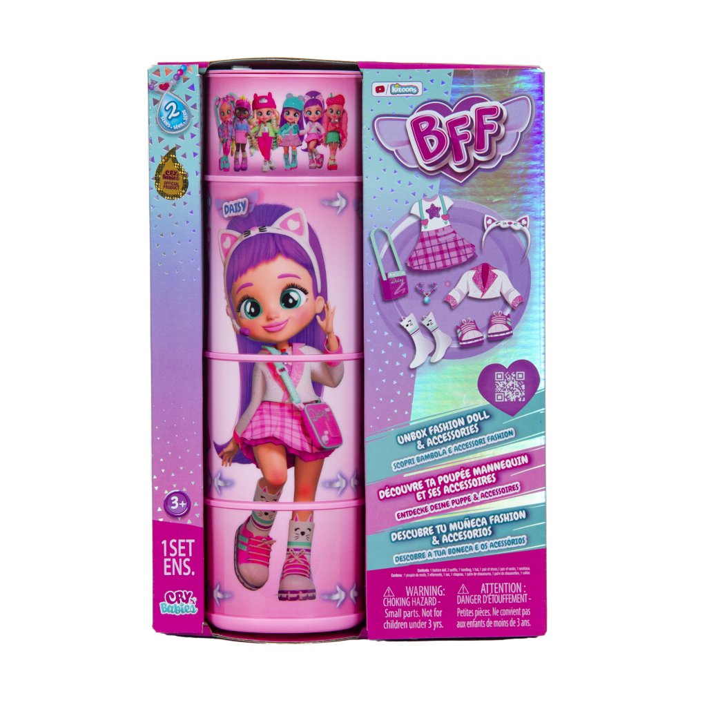 „Cry Babies BFF je sběratelská módní panenka, která ti umožní vyjádřit se, hrát si s módou a ztotožnit se svou oblíbenou postavou z animovaného seriálu Cry Babies Magic Tears. Panenka je vysoká 20 cm, má 15 cm dlouhé, hedvábné nylonové vlasy a spoustu módních doplňků. Tělo panenky má 6 ohebných...