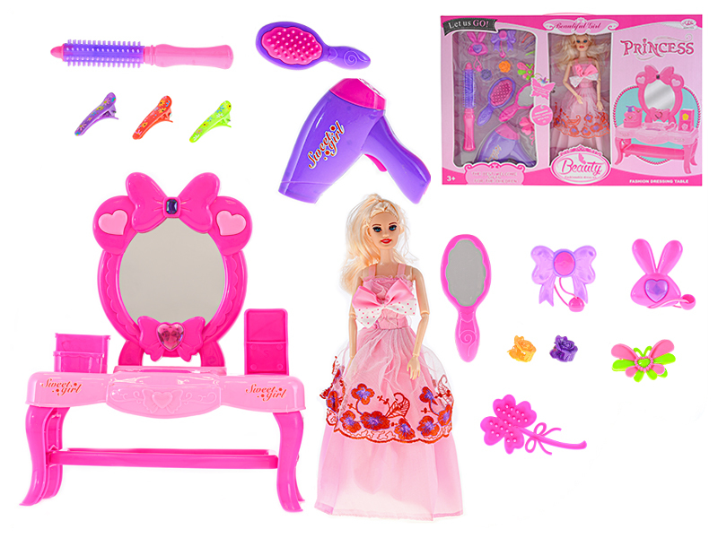 Kosmetický stolek 25x11x30,5cm + panenka 29cm s doplňky v krabičce