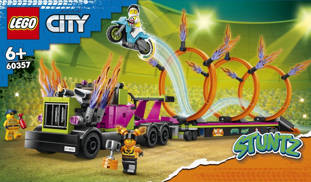 Připravte se na výzvu LEGO® City s ohnivými kruhy! Pomozte najet s obřím tahačem na místo a přichystejte ohnivé kruhy pro první pokus. Nasaďte si přilbu a rozjeďte motorku se setrvačníkem. Najeďte ve vysoké rychlosti na rampu a proskočte jedním… dvěma… třemi ohnivými kruhy! Zvyšte vzdálenost mezi ohnivými kruhy a připravte ještě větší výzvu. Jak daleko dokáže kaskadérská motorka doletět? To zjistíte sami!
