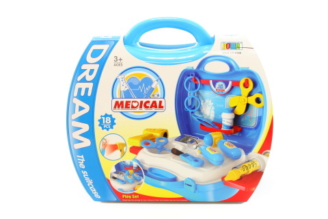 Doktorská sada obsahuje: kufřík o velikosti cca 22x17cm, 1x brýle, 1x pilulky, 2x nůžky, 7x lékařské nástroje. Věk 3+ przeczytaj całość