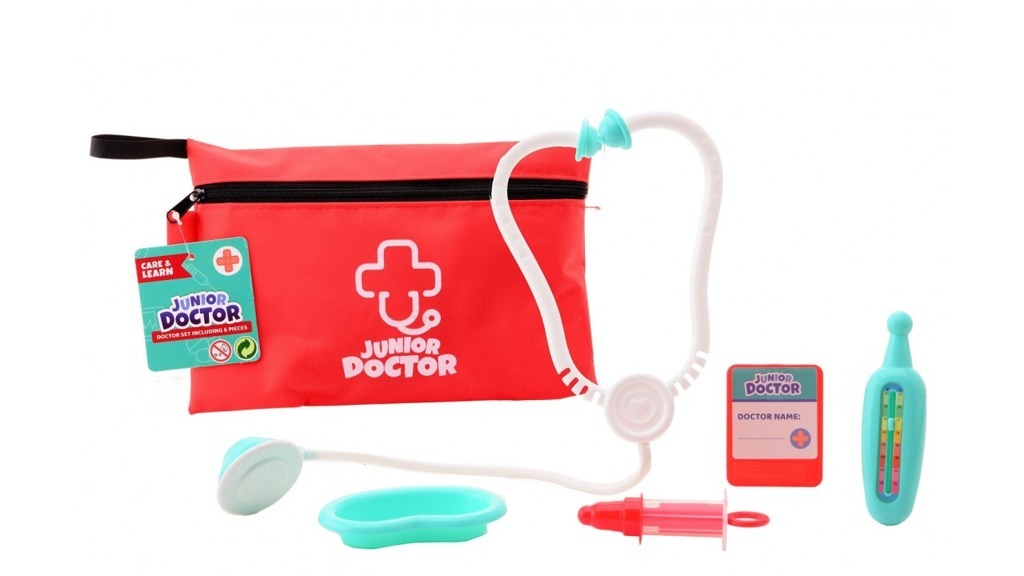 Praktická doktorská sada v taštičce. Sada obsahuje teploměr, stetoskop, stříkačku a další. przeczytaj całość