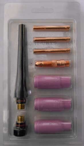 Náhradní díly k hořákům TIG WP17, WP26 - 9ksSada obsahuje:3ks keramická hubice vel. 4, 5, 61ks držák kleštiny pr. 2,4 mm3ks kleština 50 mm (2 ks pr. 1,6 mm + 1ks pr. 2,0 mm)1ks kryt elektrody krátký1ks kryt elektrody dlouhý przeczytaj całość