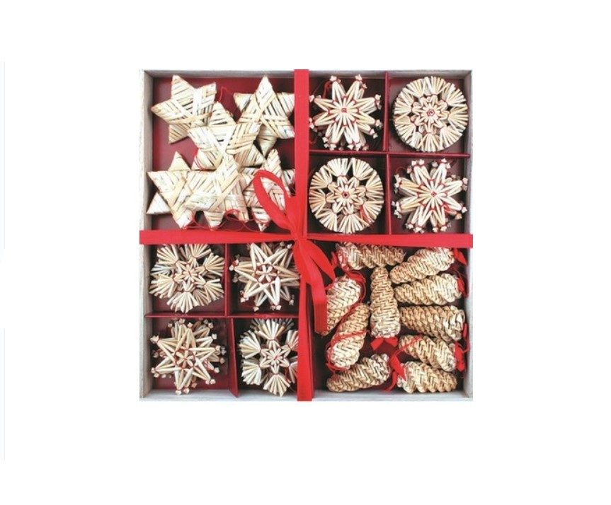 Sada 56 ks slaměných ozdob na Vánoční stromeček v dřevěné krabičce.Přírodní, ručně vyrobené vánoční ozdoby. przeczytaj całość