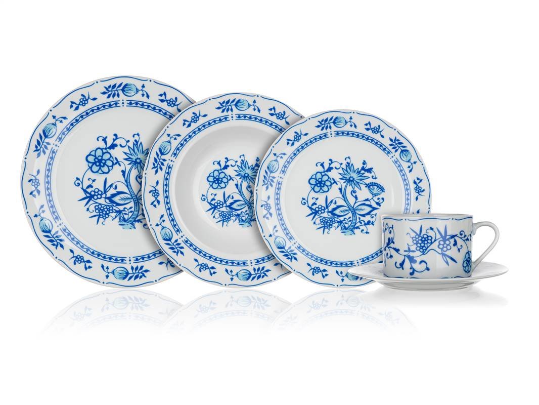 30-częściowy zestaw obiadowy Cibulák z dekoracją cebulową oferuje kompletną zastawę dla maksymalnie sześciu osób. Zawiera 6 talerzy głębokich o średnicy 21,5 cm, 6 talerzy płytkich o średnicy 24 cm, 6 talerzy deserowych o średnicy 19 cm oraz 6 filiżanek ze spodkami. Wszystko wykonane z wysokiej jakości i wytrzymałej porcelany, która zapewnia długą żywotność i ponadczasowy design, doskonale uzupełniający każdy stół.