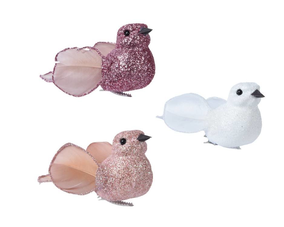 Ptáček na klipsu s peřím a textilními křídly.V balení 3 barvy ptáčků - tmavě růžová, světle růžová, bílá. 3 ks v plastové krabičce.Materiál - polystyrenRozměry - cca 10 cm przeczytaj całość