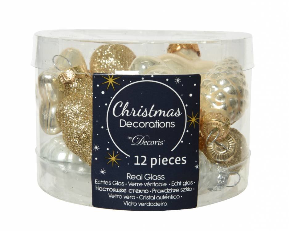Vánoční ozdobičky na stromeček v různých tvarech v bílo-zlatých barvách.12 kusů v plastové dóze.Materiál - skloRozměry - velikost cca 3 cm przeczytaj całość
