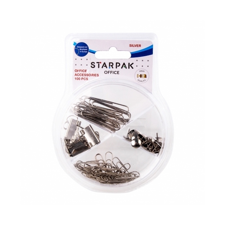 Kancelářské doplňky -sada obsahuje kancelářské sponky, připínáčky a sponky v mědi nebo stříbře. Rozměry balení (cm) 12x16x3. Balené v průhledné krabičce. przeczytaj całość