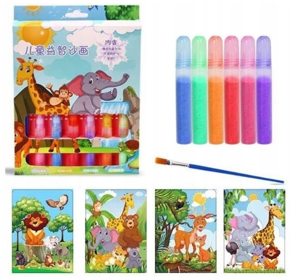 MALOWANIE PIASKIEM - DZIKIE ZWIERZĘTA KARTON, pak-126 W zestawie pędzelek,4 szablony-nakleki oraz 6 kolorowych pisaków z piaskiem do malowania przeczytaj całość