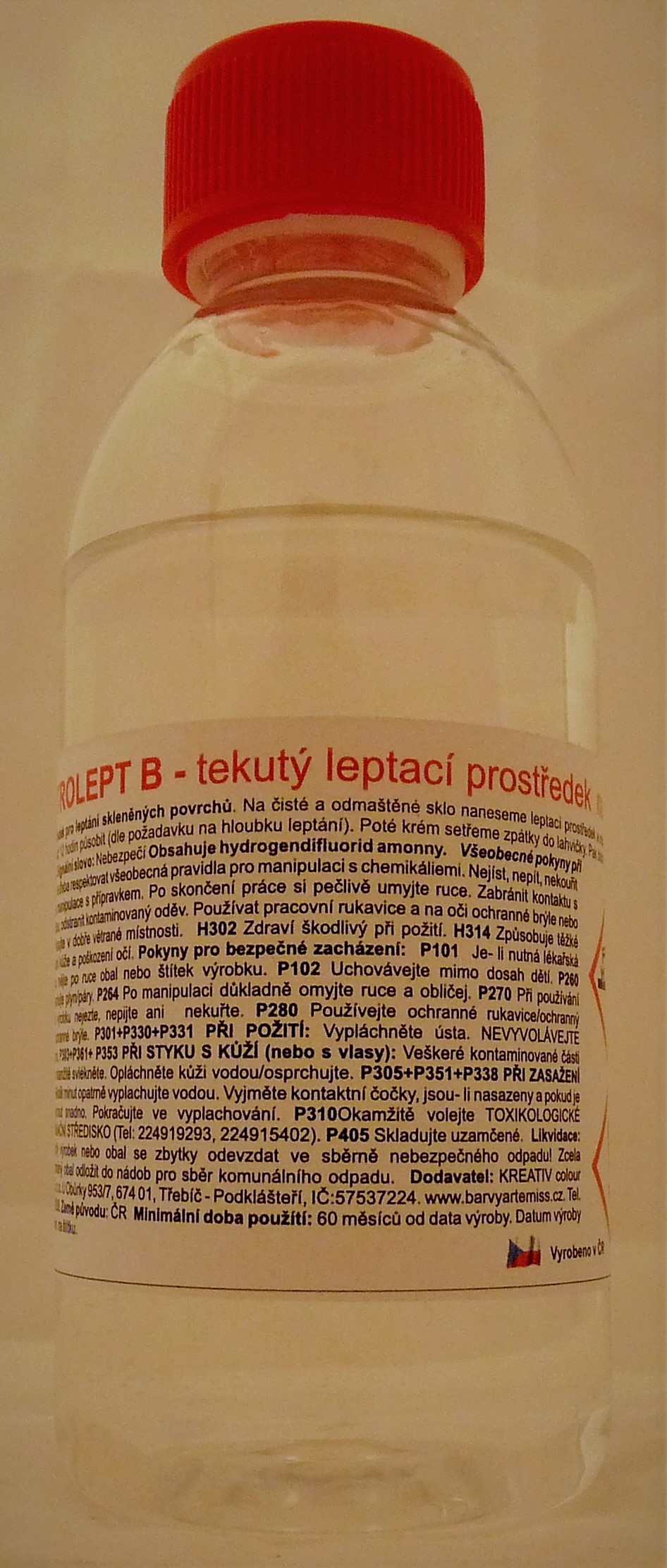 Čisté, odmaštěné sklo ponořte do leptací kapaliny a nechejte několik minut až hodin působit. Pak dobře opláchěte vodou.Kapalinu nestačí na sklo natřít, je nutné sklo do ni ponořit.Nemusí fungovat na veškerá skla, je nutné vyzkoušet.Leptací voda se prodává v sadě, která obsahuje:leptací...