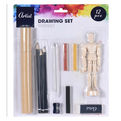 Set na kreslenie pre umelcov na výtvarnú výchovu. Sada 12 ks. Sada obsahuje: ceruzku tvrdosť HB, 5B a 6B, strúhadlo, gumu, 2xpapierové roztieratko, 3xpastel, papierový tubus a drevenú figúrku (veľkosť 155 mm). przeczytaj całość