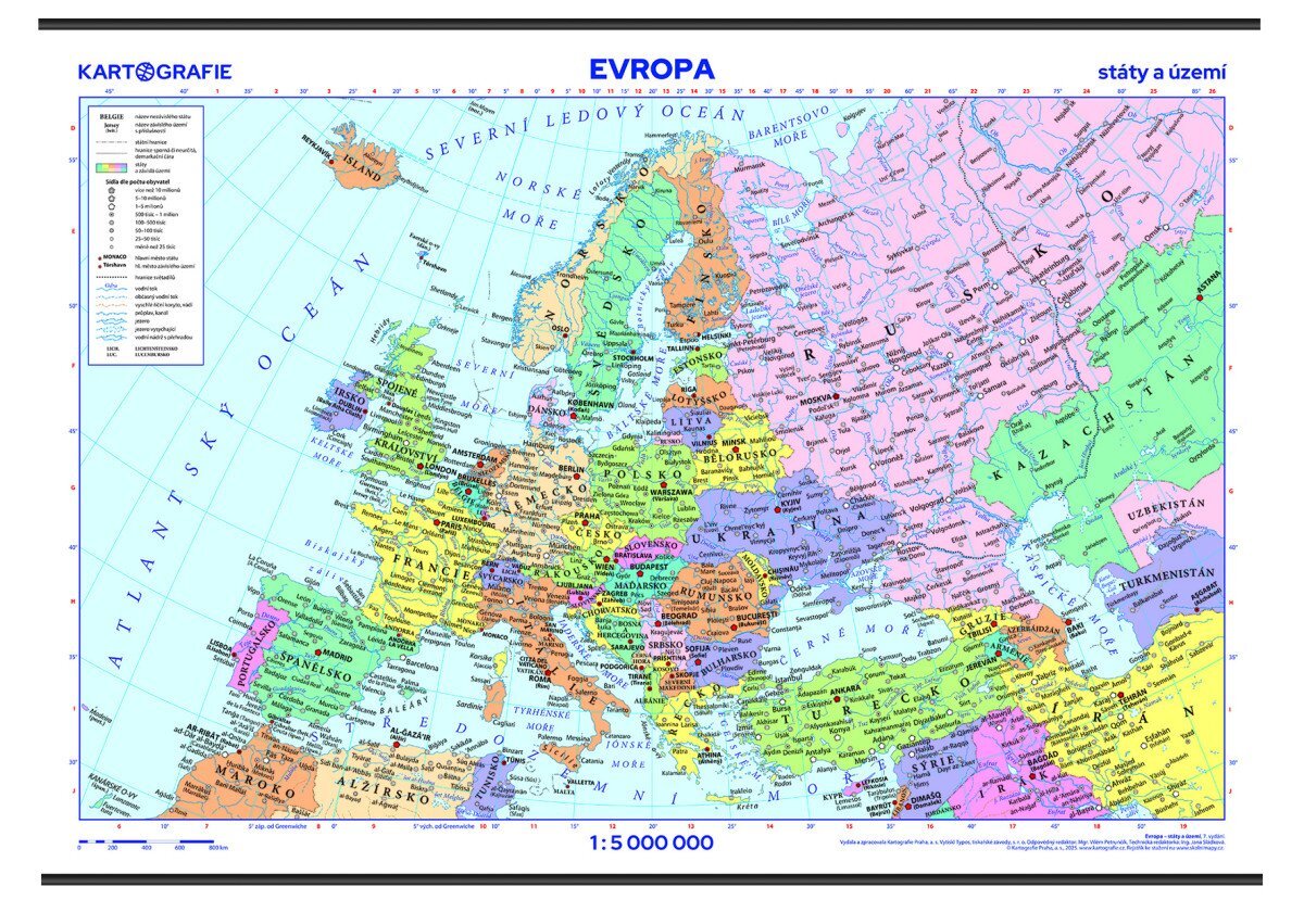 Nástěnná mapa, v novém vydání, přehledně zobrazuje politické uspořádání evropského kontinentu. Na mapě jsou znázorněny a popsány jednotlivé územní celky, hlavní a významná města. nezávislá a závislá území hlavní a významná města Laminovaná mapa s dřevěnými lištami Rejstřík k této mapě...