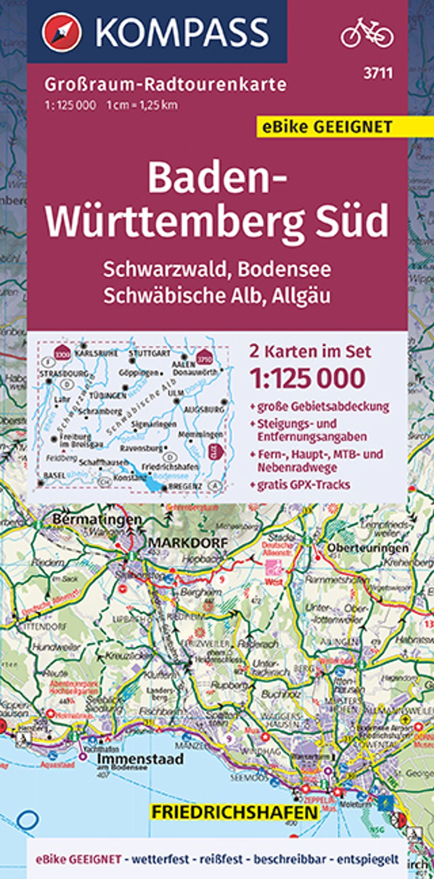 KOMPASS Großraum-Radtourenkarte 3711, Baden-Württemberg Süd, Schwarzwald, Bodensee, Schwäbische Alb, Allgäu 1:125000 (niemiecki)