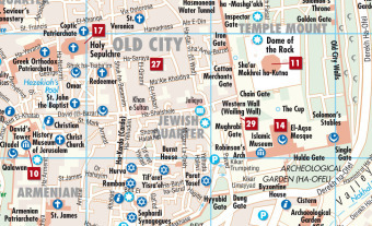 Unsere folienbeschichtete, gefaltete Karte von Jerusalem in der 4. Auflage beinhaltet: Jerusalem 1:8 000, Bethlehem 1:11 000, den Großraum Jerusalem 1:30 000, den zentralen Teil Israels 1:400 000, den Felsendom, die Grabeskirche, eine administsrative Übersichtskarte des Mittleren Ostens mit den...