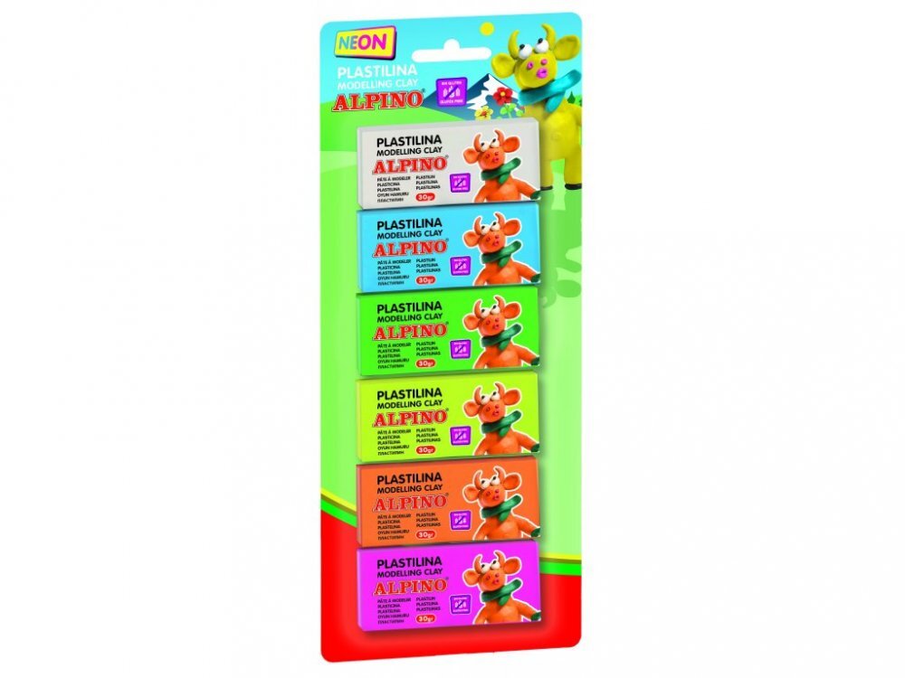 Alpino modelovací hmota 6ks á 30 gr.balení 6ks modelovací hmoty po 30gr. různé fluorescenční barvyflexibilní, plastická, jemná a pružná plastelínajasné barvy, které lze míchat, bez zápachu, bezlepková, vhodná pro všechny ruční práceUpozornění: Nevhodné pro děti do 3 let. Obsahuje malé části....