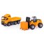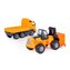 Ciężarówka z przyczepą i wózkiem widłowym. Do zestawu dołączono również zestaw klocków. Pojazdy posiadają obrotowe koła. Możemy się nimi poruszać do przodu i do tyłu. Kształty aut przypominają prawdziwe pojazdy znane z prac remontowych i budowy. Wózek widłowy posiada kabinę z siedziskiem w środku...