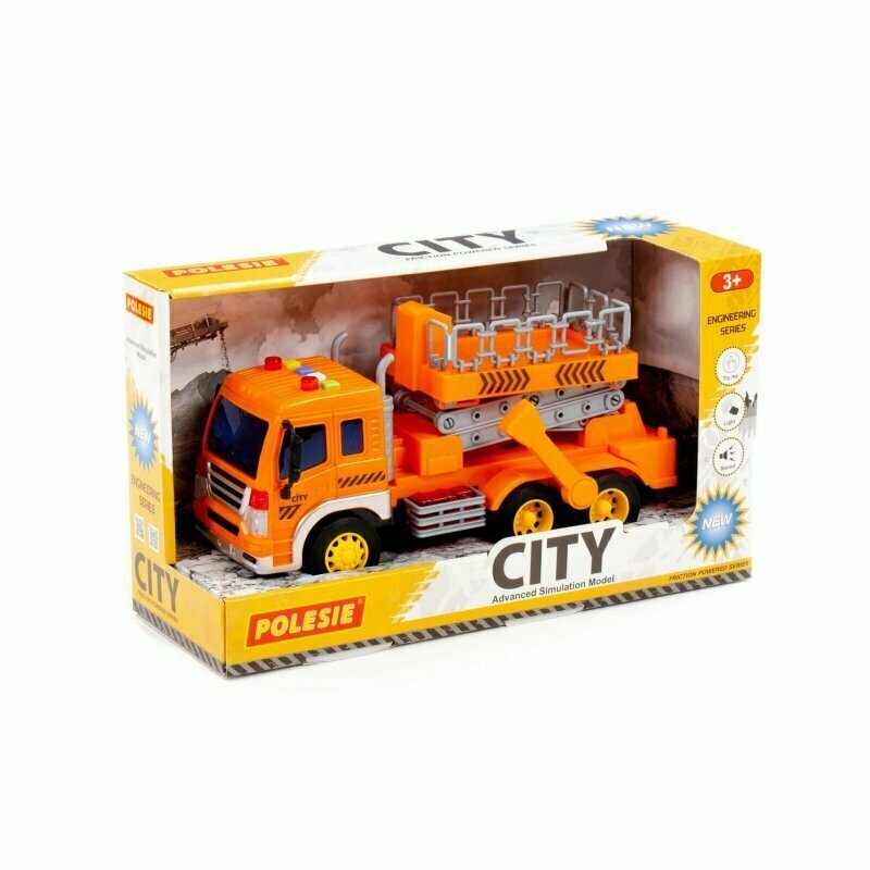 Polesie 89748 Samochód City z podnośnikiem pomarańczowy ze światłem i dźwiękiem w pudełku