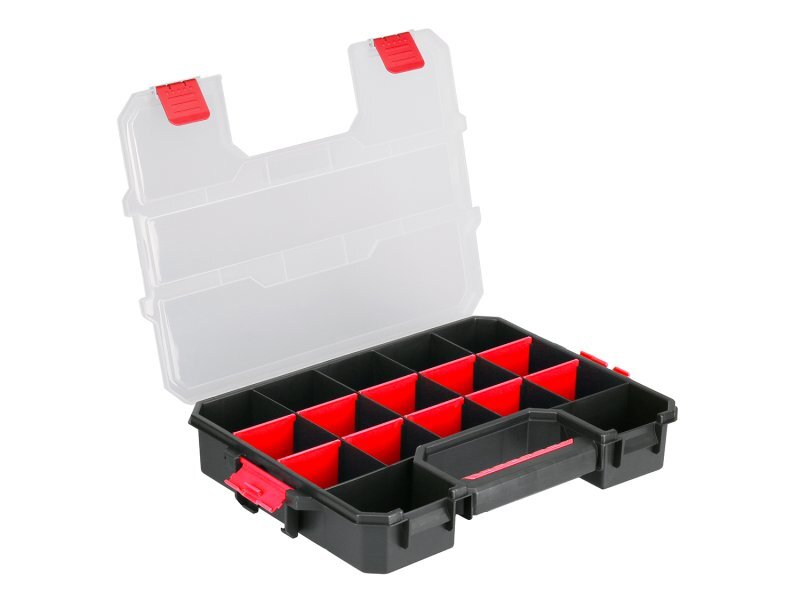 organizér stohovatelný - 17 oddílů 10 dělících přepážek odnímatelných pro variabilní úpravu velikosti jednotlivých oddílů transparentní víko, boční zámky pro sepnutí několika organizérů při stohování odolné plastové zámky víka rozměr 37.5 x 29 x 6.7 cm przeczytaj całość