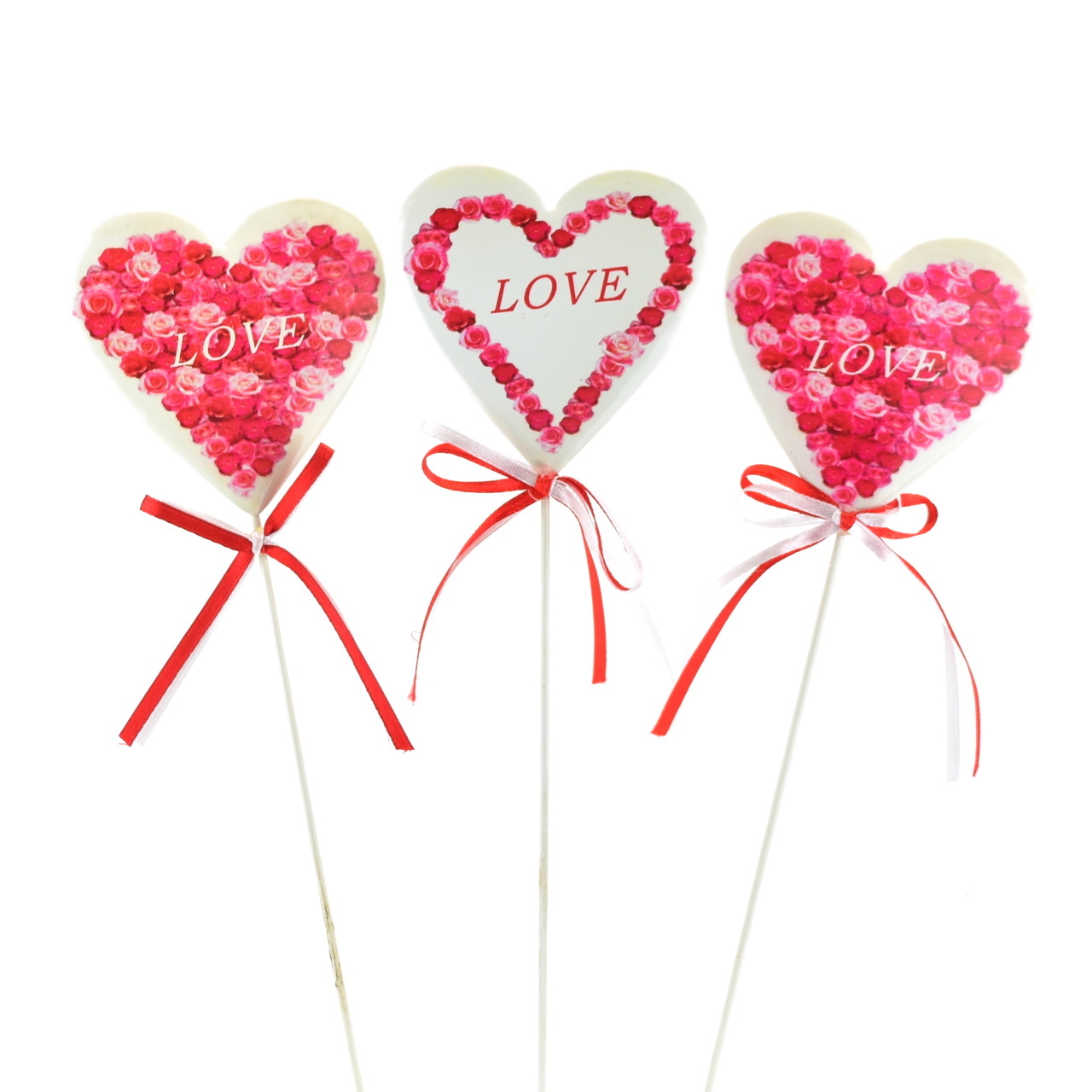 Valentýnské srdíčko zápich s mašličkou s motivem růžiček a nápisem LOVE. Set 3 ks.Materíál: kov, textil.Velikost 27 cm včetně špejle, 7,5x7 cm velikost srdce. przeczytaj całość
