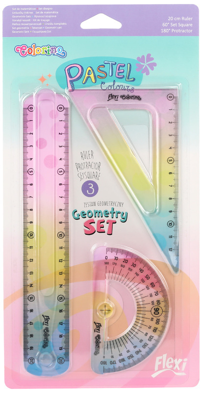 Zestaw geometryczny 3 elementy Zestaw zawiera: linijka 20 cm, ekierka i kątomierz w pastelowych kolorach przeczytaj całość