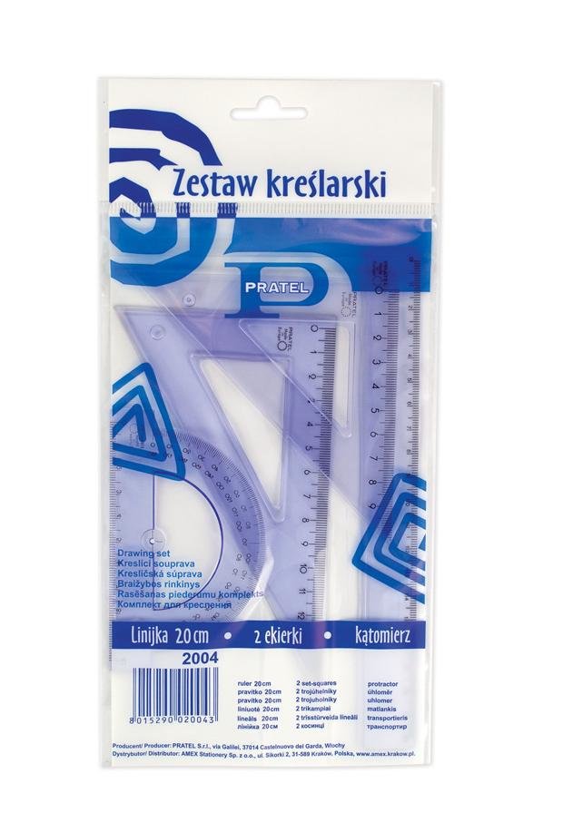 Zestaw kreślarski PRATEL zawiera: linijkę 20 cm, ekierkę ze skalą 10 cm i 14 cm, kątomierz 180 stopni.