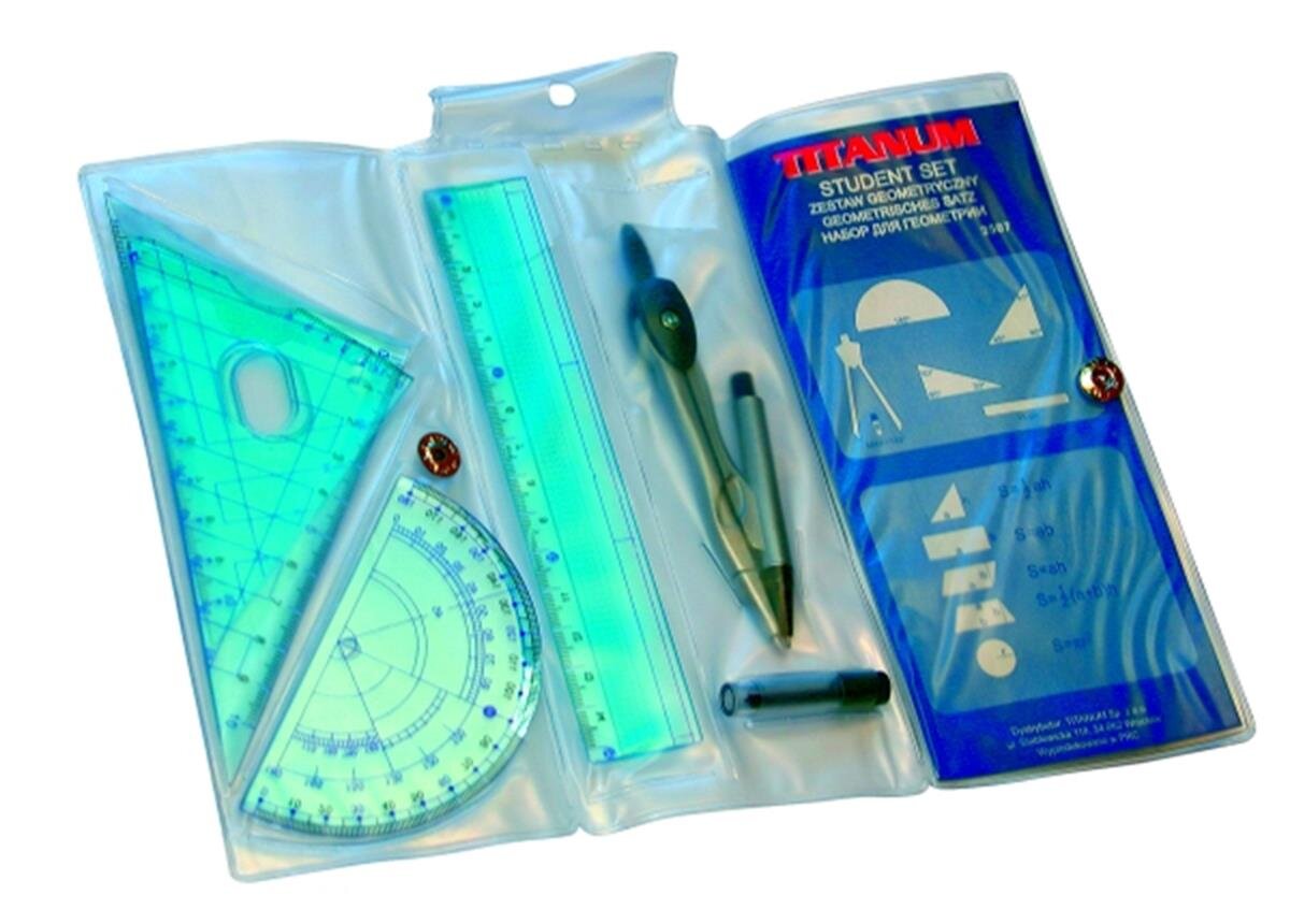 komplet geometryczny sześcioelementowy w etui PCV w zestawie: cyrkiel z ołówkiem automatycznym, linijka, kątomierz, 2 ekierki, zapas grafitów przeczytaj całość