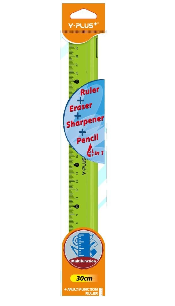 Linijka 4w1, 30 cm. Linijka, Gumka, temperówka, ołówek. przeczytaj całość