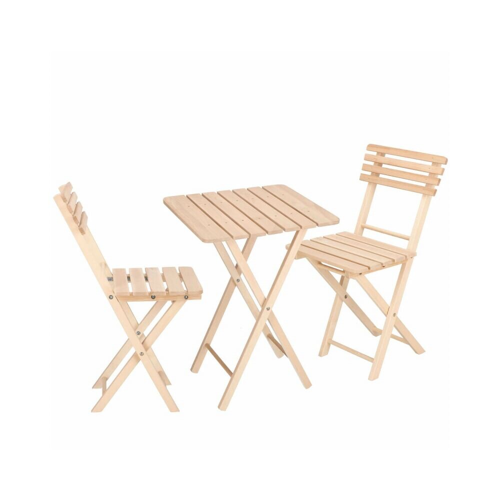 Elegantní set dřevěného nábytku stůl a dvě židle, ideální pro menší prostory a balkony. Vyrobeno z pevného bukového dřeva s vysokou odolnost vůči povětrnostním vlivům. Díky praktickému skládacímu provedení se snadno přenáší a uskladňuje. Vhodné pro venkovní použití. Nosnost židle 125 kg, stůl 30...