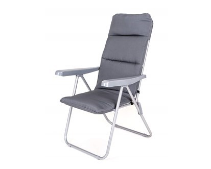 Polstrovaná skládací židle s možností polohování (5 pozic). Materiál: ocelová konstrukce s područkami, doplněna polstrováním o síle 5 cm z polyesteru 160 g, zajišťuje velice pohodlné posezení. Nosnost židle je 100 kg. przeczytaj całość