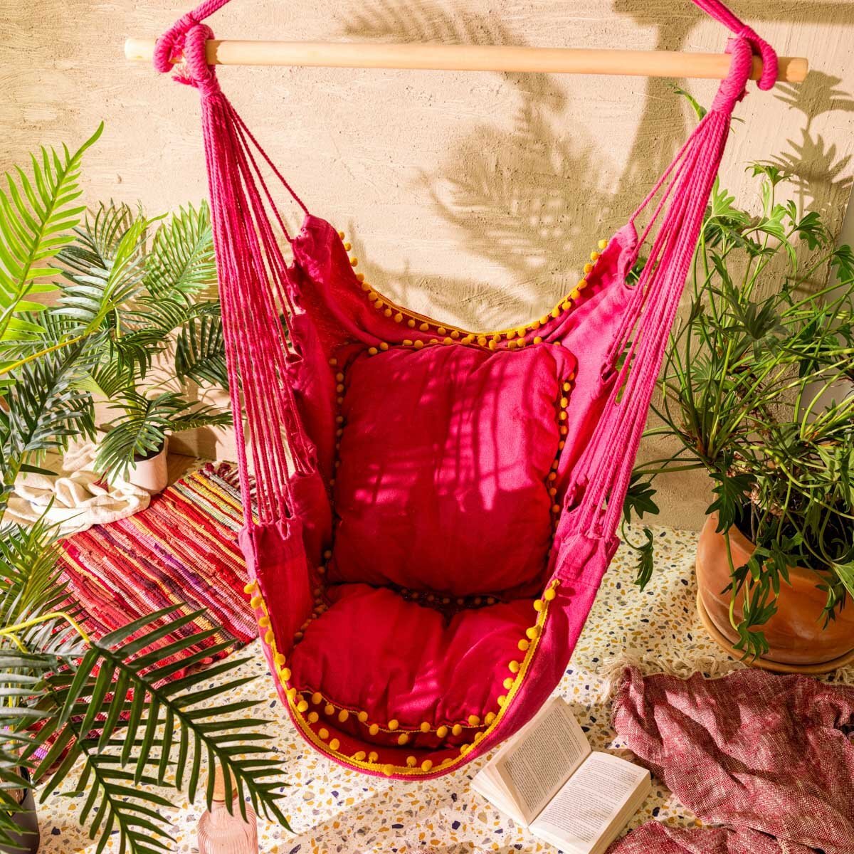 Zavěsné houpací křeslo | PESTRI | s barevnými fuchsiovými pompóny | 90x100x130 cm | 890142 Homla