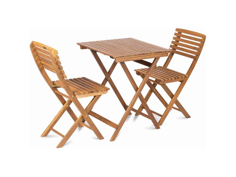Větší a pohodlnější sestava balkónového nábytku. Lehce rozložitelný čtvercový stolek o rozměrech 65 x 65 cm je doplněn dvojicí židlí 55 x 40 x 81 cm. K židlím je možné dokoupit sadu polštářů sedáku a zádové opěrky. Všechny komponenty je možné snadno složit a minimalizovat tak nároky na jejich uskladnění. Stůl i židle jsou vyrobeny z tropické dřeviny Akácie. Toto velice tvrdé dřevo bez problémů odolává i nepřízni povětrnostních vlivů