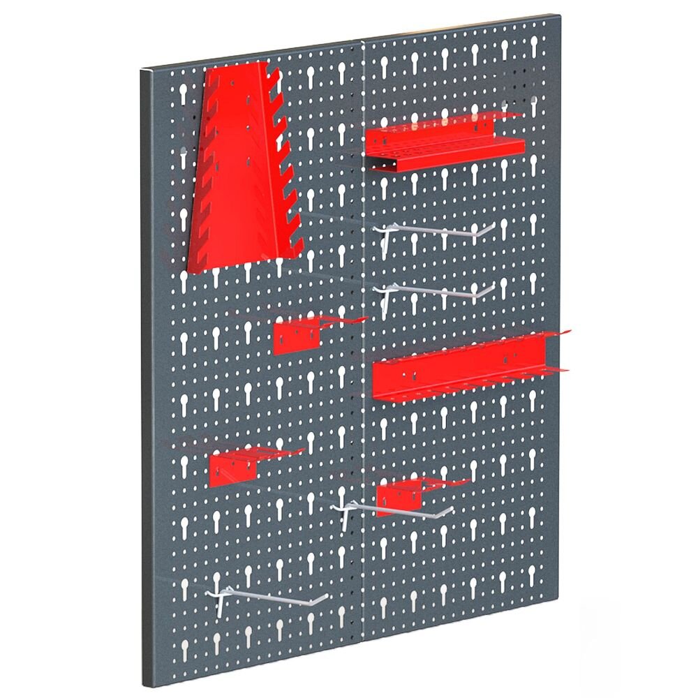 Solidna metalowa ściana na narzędzia z perforacją umożliwiającą łatwe zawieszanie haków i uchwytów. Odporna na uderzenia i odkształcenia, pokryta wysokiej jakości powłoką proszkową. Zawiera 10-elementowy zestaw uchwytów do różnych rodzajów narzędzi. Zmienny układ mocowań pozwala na przejrzyste uporządkowanie. Praktyczne rozwiązanie do zawieszenia oszczędza miejsce na stanowisku pracy. Wymiary 60x60x2 cm.