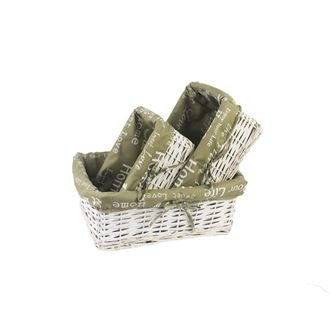 Sada proutěných zásuvek s látkou.Malá zásuvka má rozměry 28 x 19 cm, výšku 12 cm.Střední zásuvka má rozměry 33 x 24 cm, výšku 14 cm.Velká zásuvka má rozměry 40 x 29 cm, výšku 16 cm.Barva : bílá, látka - zelená.Materiál : proutí, látka. przeczytaj całość