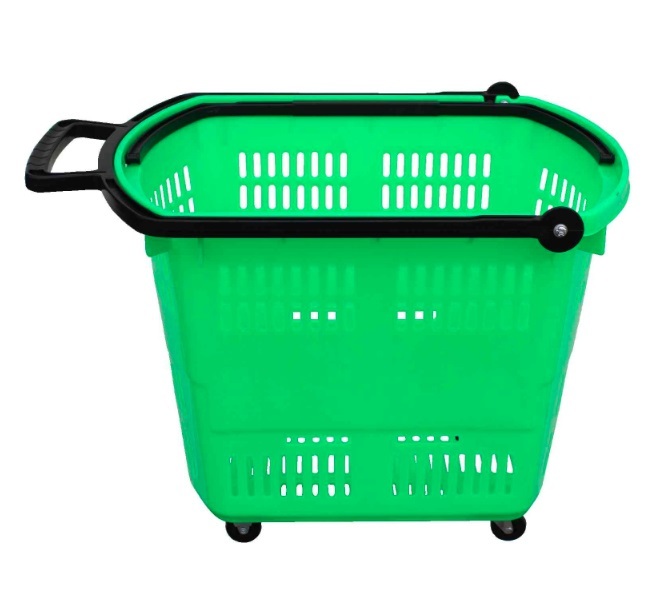 kvalitní plastový nákupní koš do samoobsluhy s uchem pro odnos a uchem pro převážení košík je vybaven kvalitními kolečky 2 kolečka jsou otočná na kuličkových ložiscích, 2 kolečka jsou neotočná barva zelená rozměry 415 x 395 x 585 mm, objem 68 litrů EAN 0000060150004 przeczytaj całość