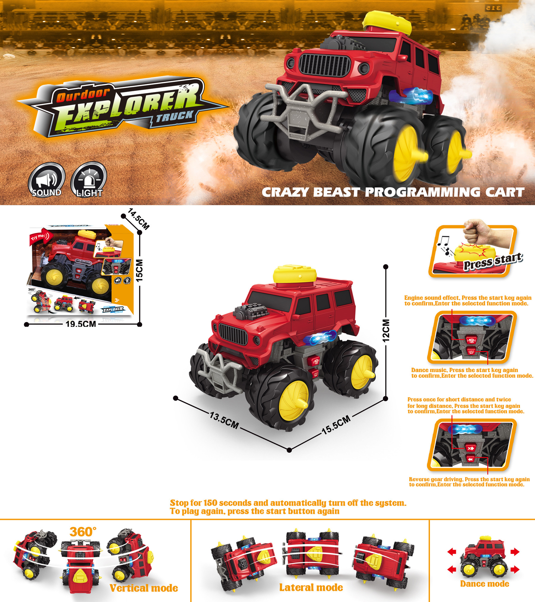 Auto terénní s efekty. Rozměry 15,5x13,5x12 cm. Světelné, zvukové a pohybové efekty tlačítkem na střeše a postranními tlačítky (zvuk motoru, hudba, jízda dopředu, dozadu). 3xAAA baterie součástí. przeczytaj całość