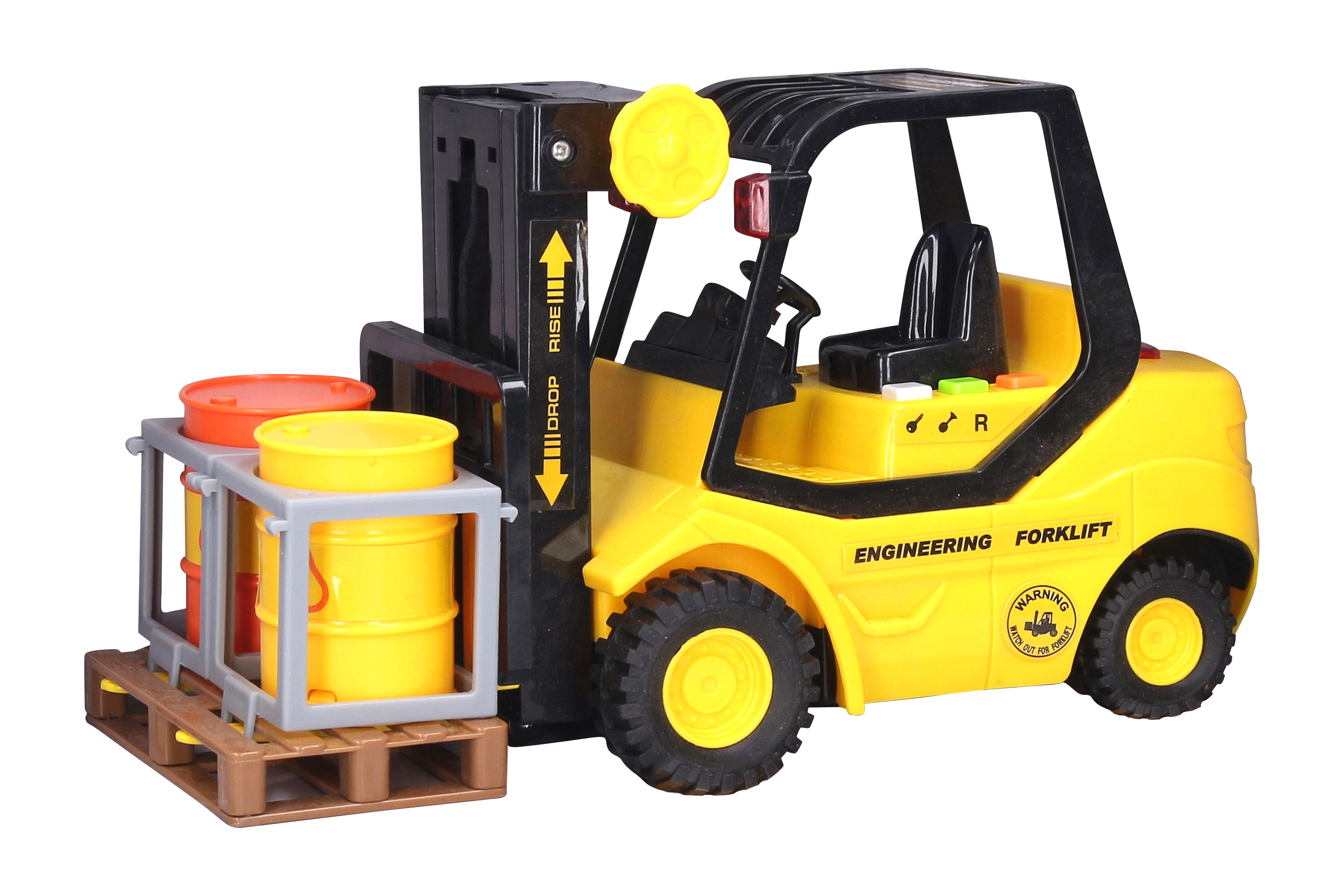 Ten żółto-czarny model oferuje płynny ruch obu części wózka, co ułatwia podnoszenie palet i naśladuje rzeczywiste sytuacje robocze. Wózek jest wyposażony w trzy przyciski, które uruchamiają efekty świetlne i dźwiękowe, dzięki czemu zabawa jest naprawdę autentyczna. Dodatkowo paletę można funkcjonalnie podnosić za pomocą żółtego pokrętła po lewej stronie wózka.