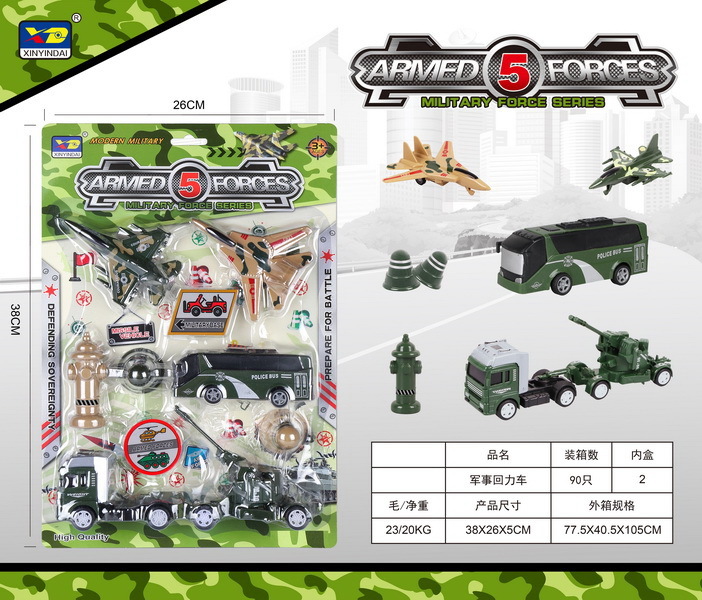 Vojenský set. Na zpětné natažení. Součástí 2 stíhačky, autobus, tahač s dělem, hydrant, 2 kužely. przeczytaj całość