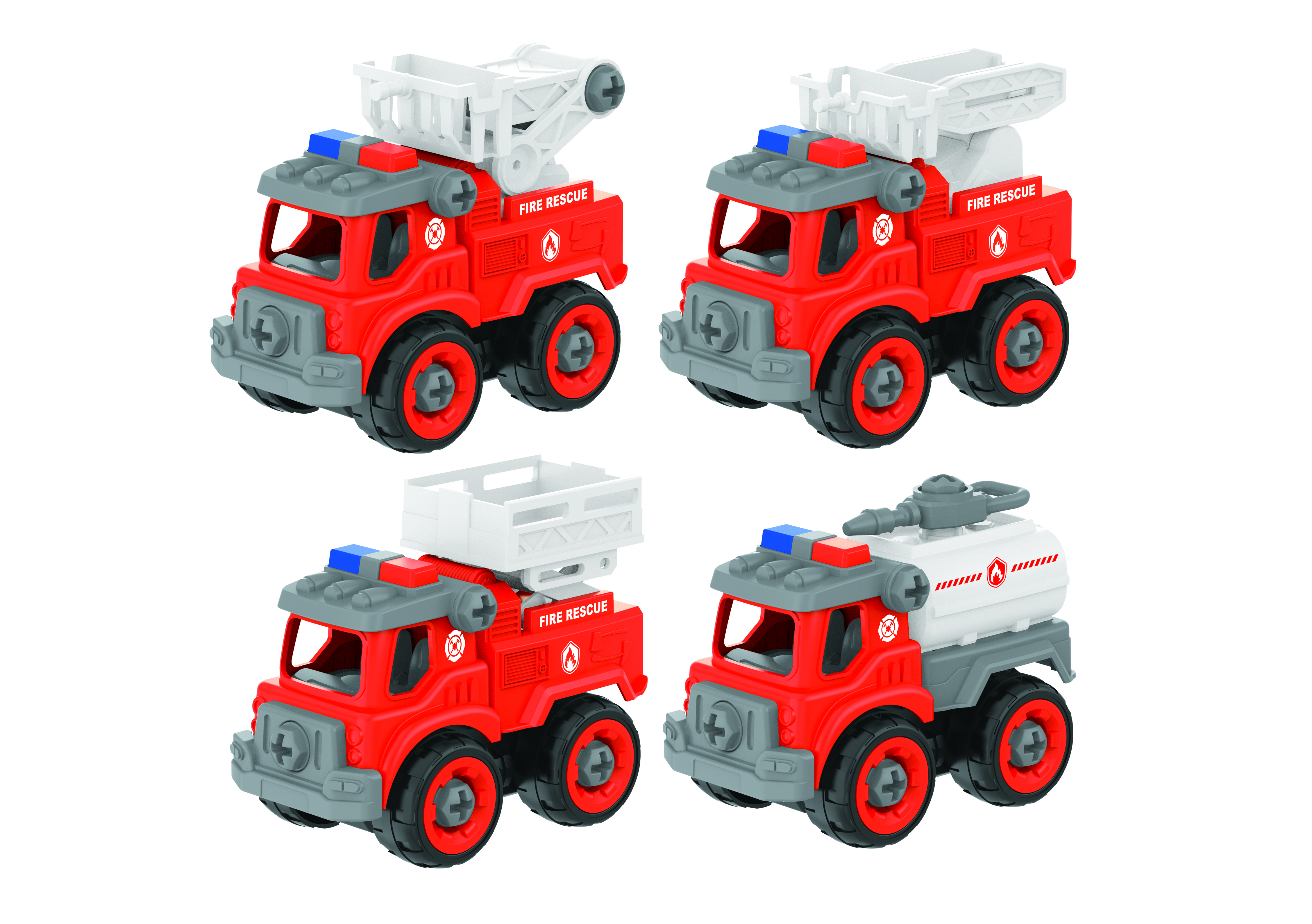 Zestaw zawiera 4 samochodziki strażackie o wielkości 13 cm, które sprawdzą się zarówno do samodzielnej zabawy w domu, jak i w podróży. W opakowaniu znajduje się także śrubokręt, który pozwala rozebrać i ponownie złożyć autka. Dzięki temu dzieci w zabawny sposób rozwijają kreatywność i umiejętności techniczne.