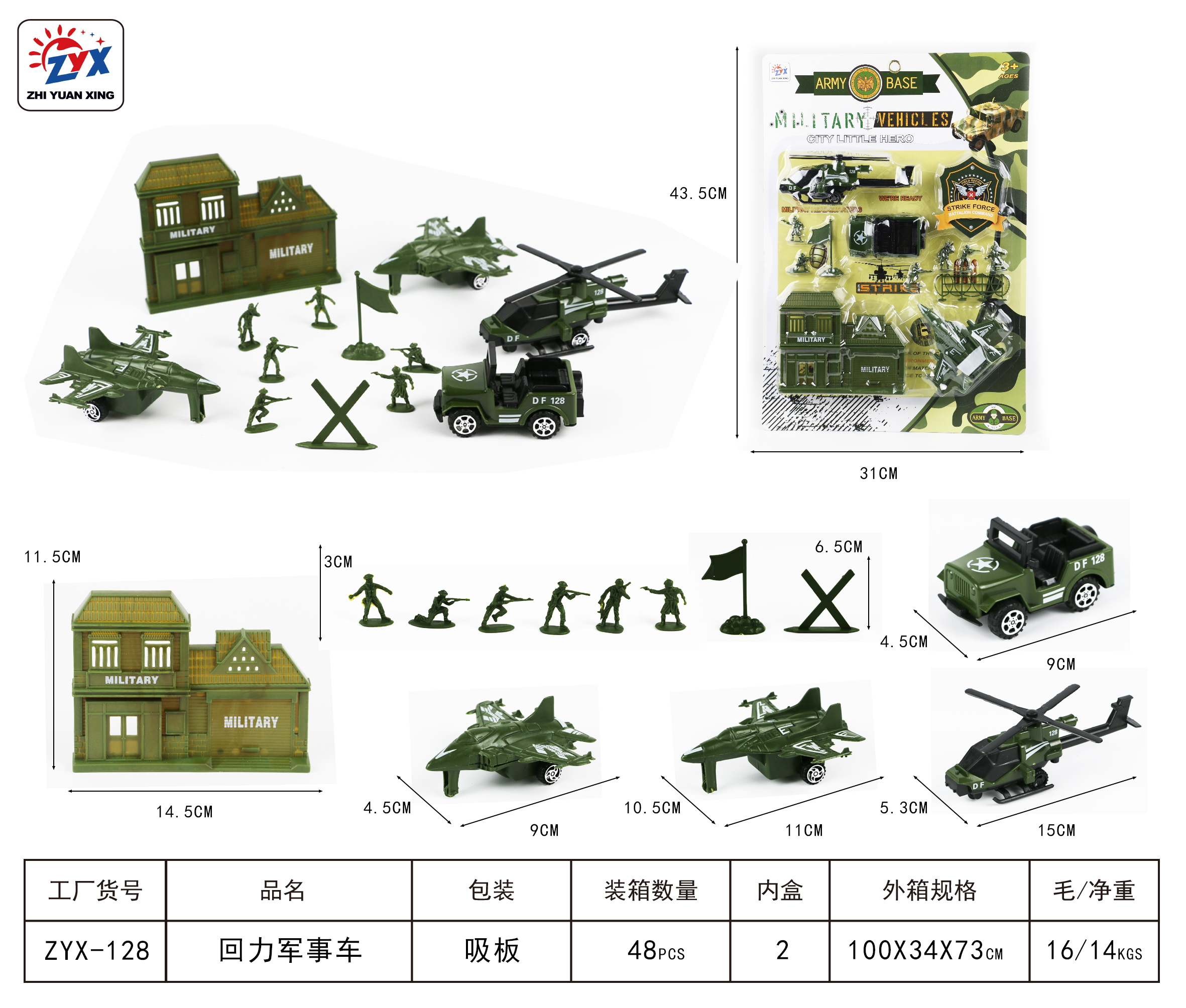 Vojenská technika. Rozměry domu 14,5x11,5 cm, auta 4,5x9 cm. Na zpětné natažení. przeczytaj całość