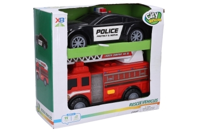 Auta policejní a hasičské s efekty. Velikost 23 cm. Volná kola. Světelné a zvukové efekty tlačítkem na střeše policejního auta a tlačítkem na levém boku hasičského auta. 2xAG13 baterie pro každé auto součástí. przeczytaj całość