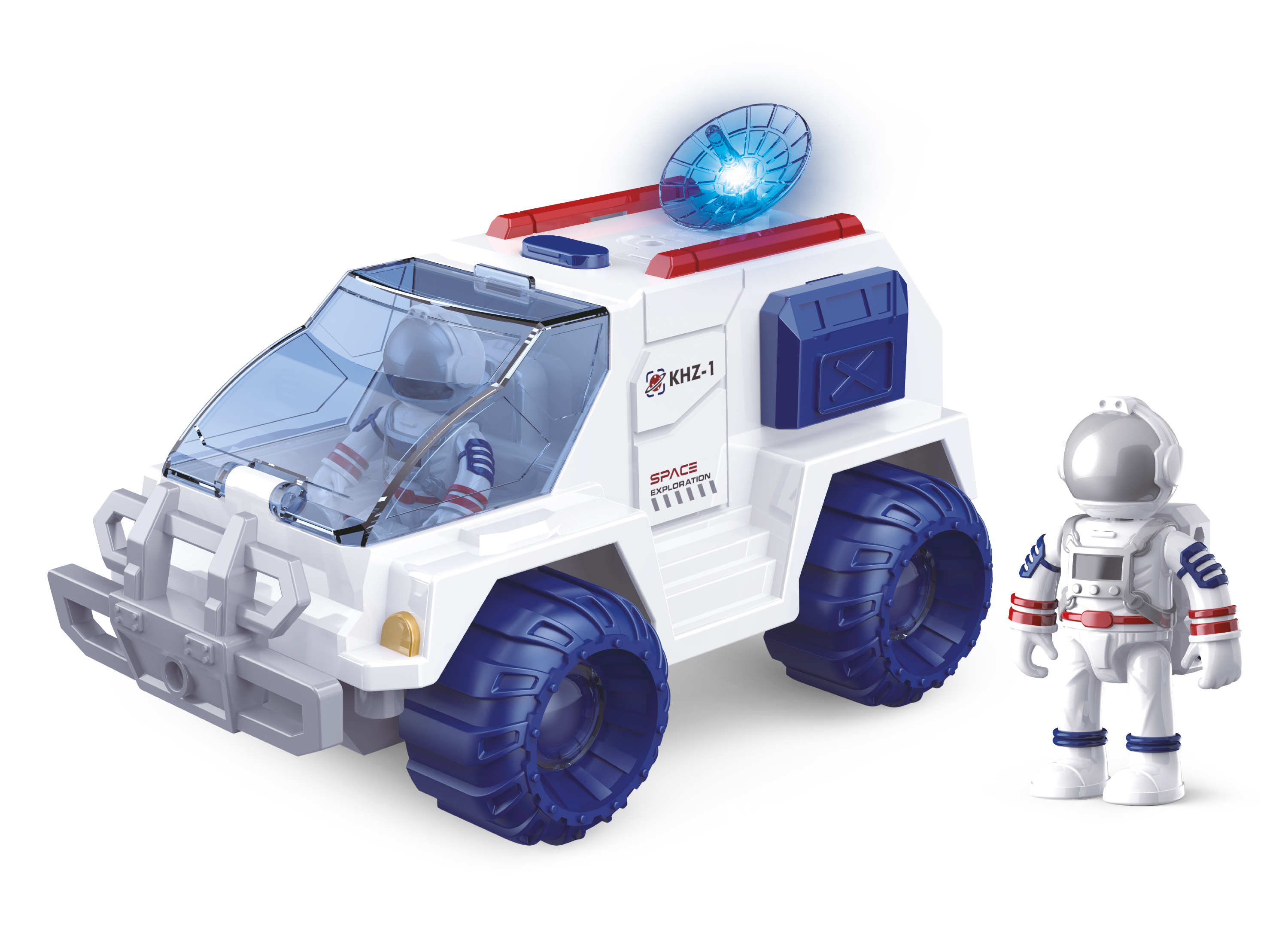 Vesmírné vozidlo s kosmonautem. Velikost auta 17 cm. Na setrvačník. Světelné a zvukové efekty tlačítkem na střeše. 3xAG13 baterie součástí. przeczytaj całość