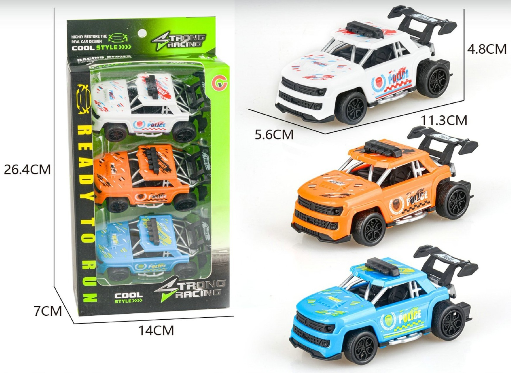 Auta policejní 3 ks. Rozměry 11x5,5x5 cm. Na zpětné natažení. przeczytaj całość