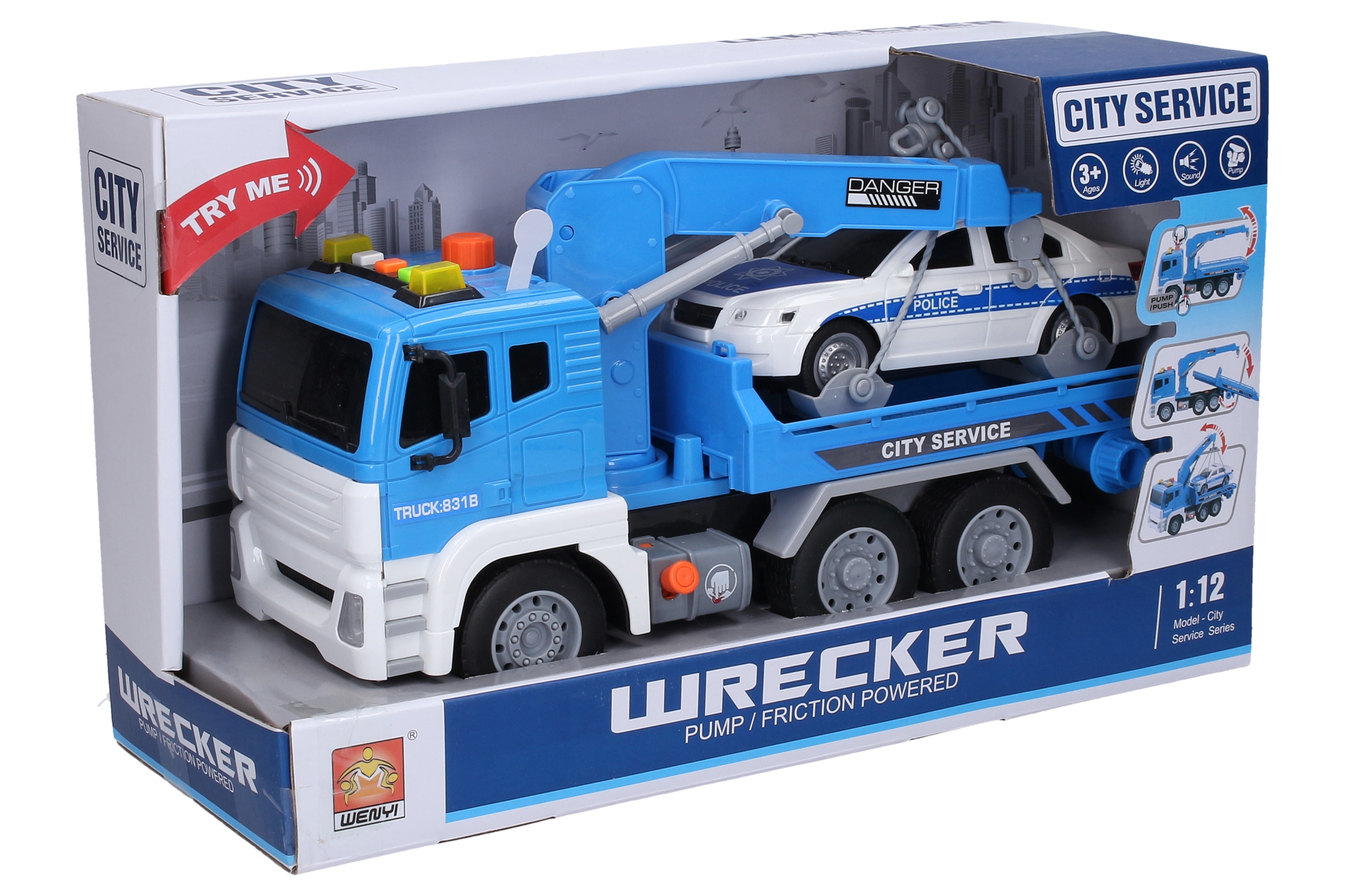 Tahač s autem a efekty. Rozměry 30x13x17 cm. Na setrvačník. Světelné a zvukové efekty tlačítky na kabině tahače. 3xAG13 baterie součástí. Velké oranžové tlačítko na kabině - hydraulika nakládacího ramene - zvedání. Oranžová páčka mezi koly položení (uvolnění) nakládacího ramene. przeczytaj całość
