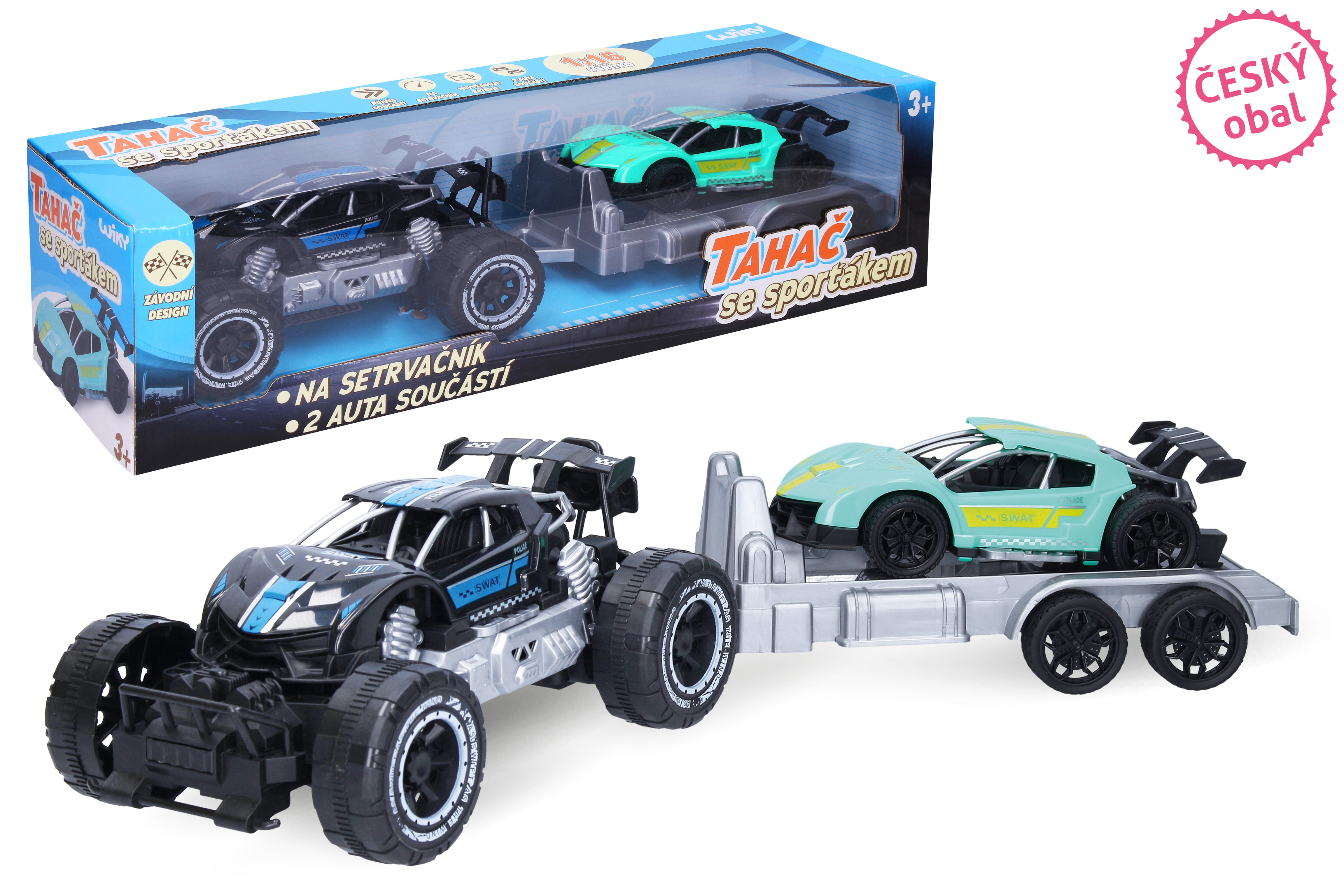 Ciężarówka z samochodem. Wymiary 45x12,5x9,5 cm. Oba samochody na napęd bezwładnościowy. Dostępna tylko jedna wersja kolorystyczna - większy samochód czarny, mniejszy zielony. przeczytaj całość
